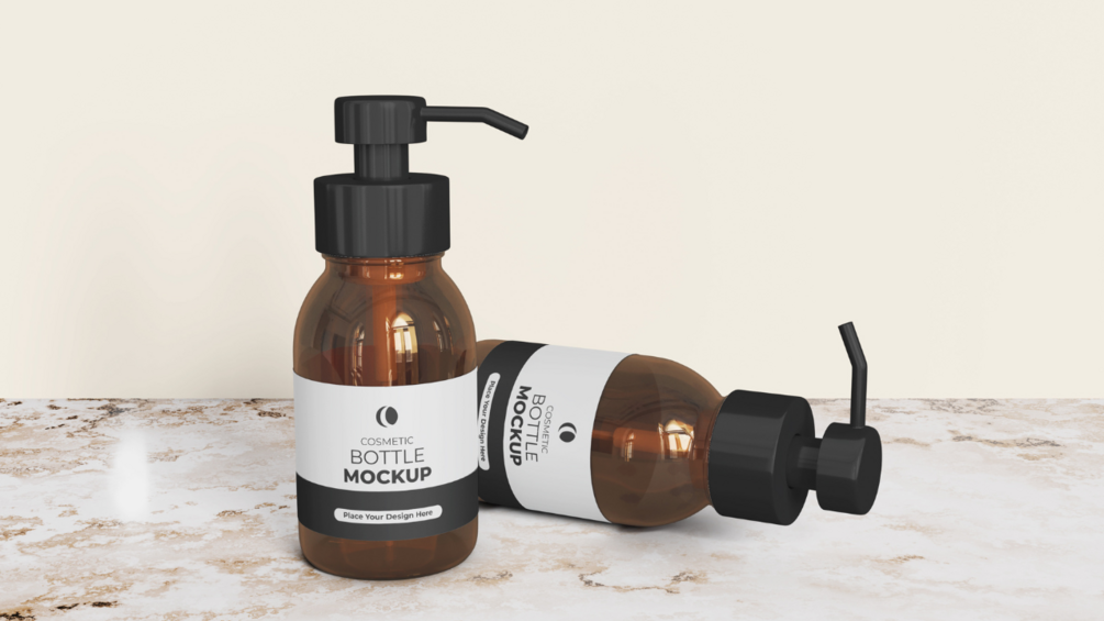 Introducing our premium Cosmetic Bottle Mockup, designed to elevate your product presentation to the next level. This mockup features elegant amber-colored bottles with sleek black pump dispensers, perfect for showcasing your cosmetic products in a professional and eye-catching manner. The bottles come with customizable white labels, allowing you to effortlessly insert your own design and branding.